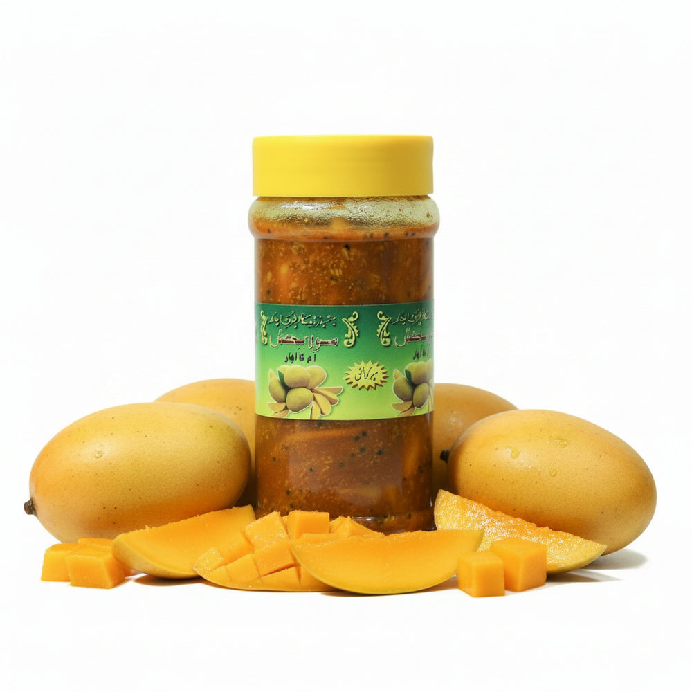 The mangoes are slow-cooked/matured with the spices and sweetener until they reach a thick, syrupy consistency, creating a truly traditional and rich taste (روایتی اور بھرپور ذائقہ).